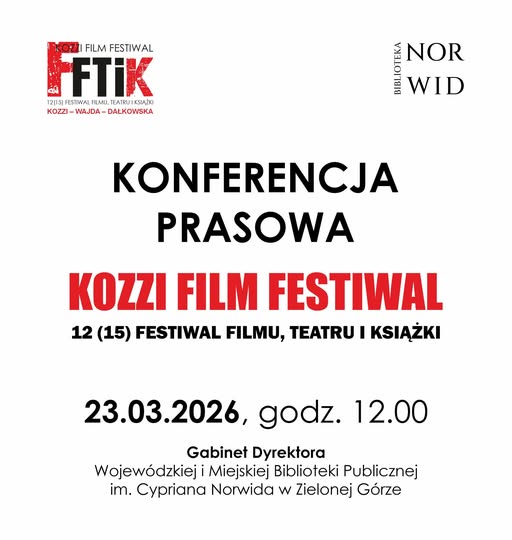 zapraszamy 23 marca, godz. 12.00 Gabinet Dyrektora (II piętro) na konferencję prasową na temat tegorocznej jubileuszowej edycji 12 (15) Kozzi Film Festiwal. Festiwal Filmu, Teatru i Książki.